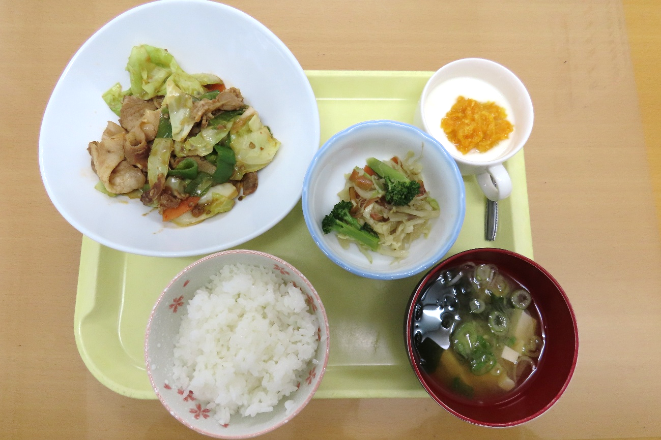 メインは回鍋肉、副菜はブロッコリー等の和え物、デザートはヨーグルト。